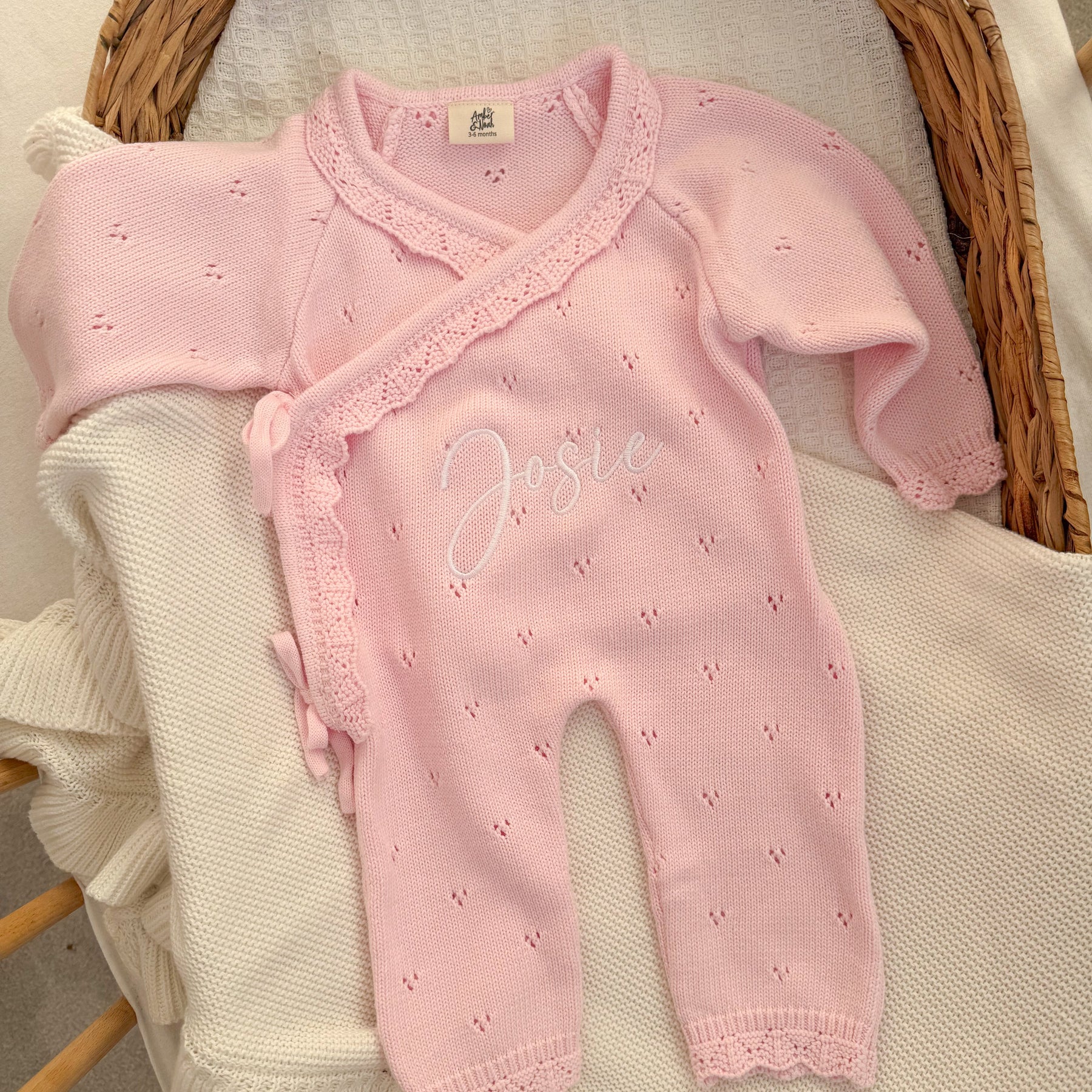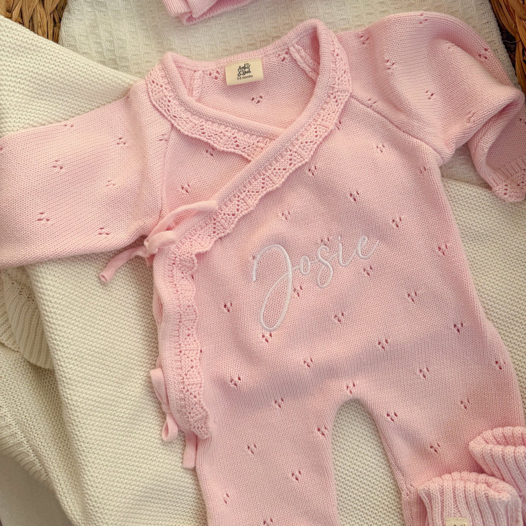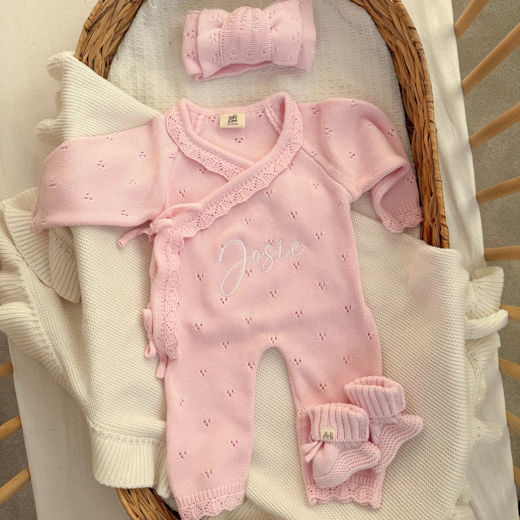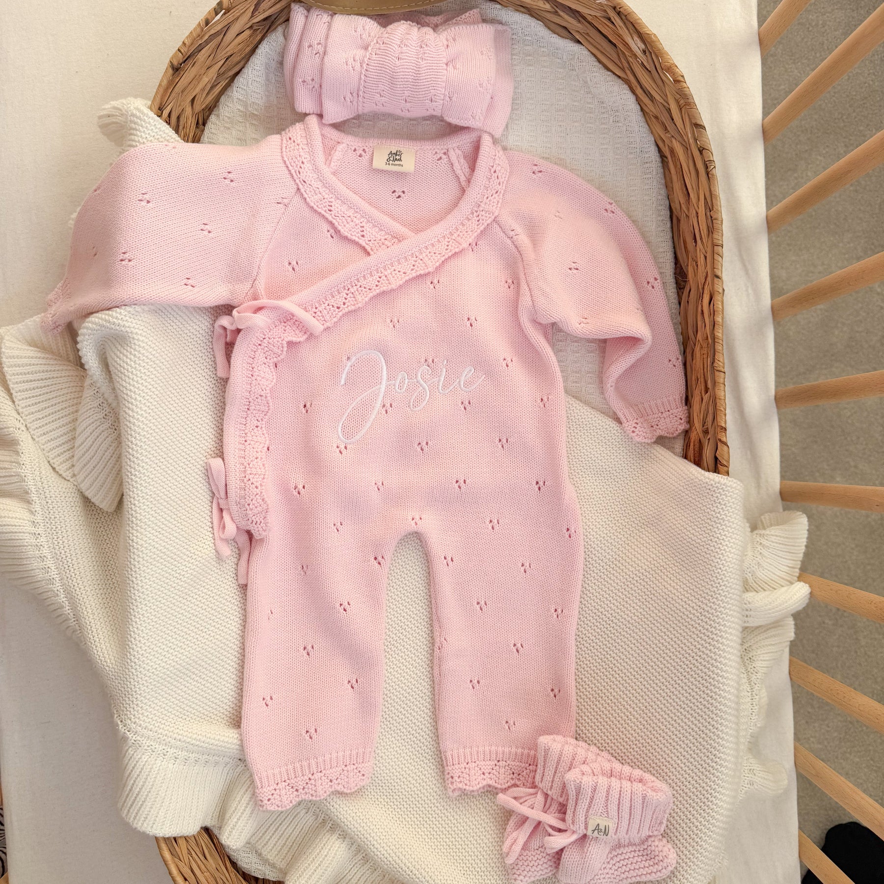 Wrap your little one in warmth and softness with our luxury personalised knitted set in a dreamy pink. Perfect for newborns and baby gifts. The most gorgeous romper for a baby girl.