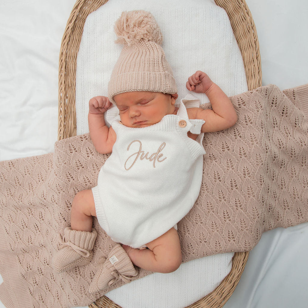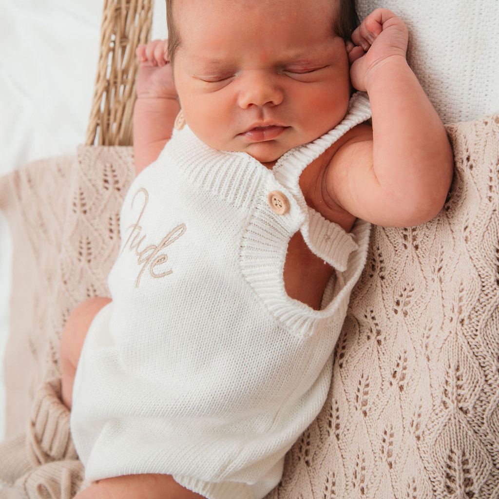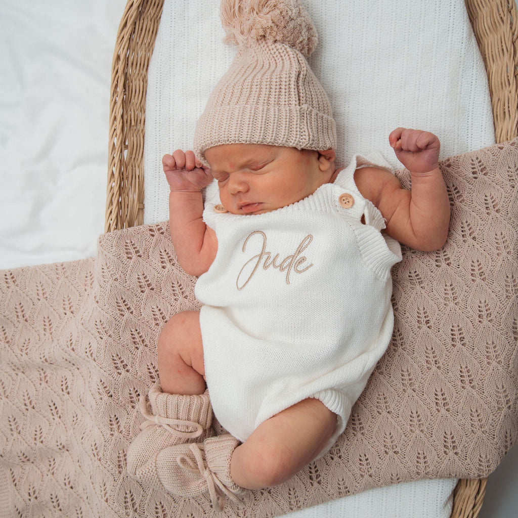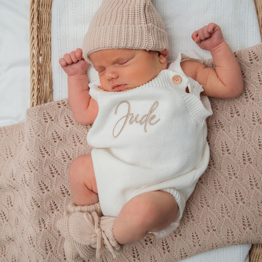 Featuring a beautifully knitted design and custom name embroidery, this romper adds a personal touch to your baby’s wardrobe. The soft, stretch cotton fabric ensures all-day comfort, while the classic neutral tones make it a versatile unisex baby outfit — ideal for baby boys and baby girls alike.