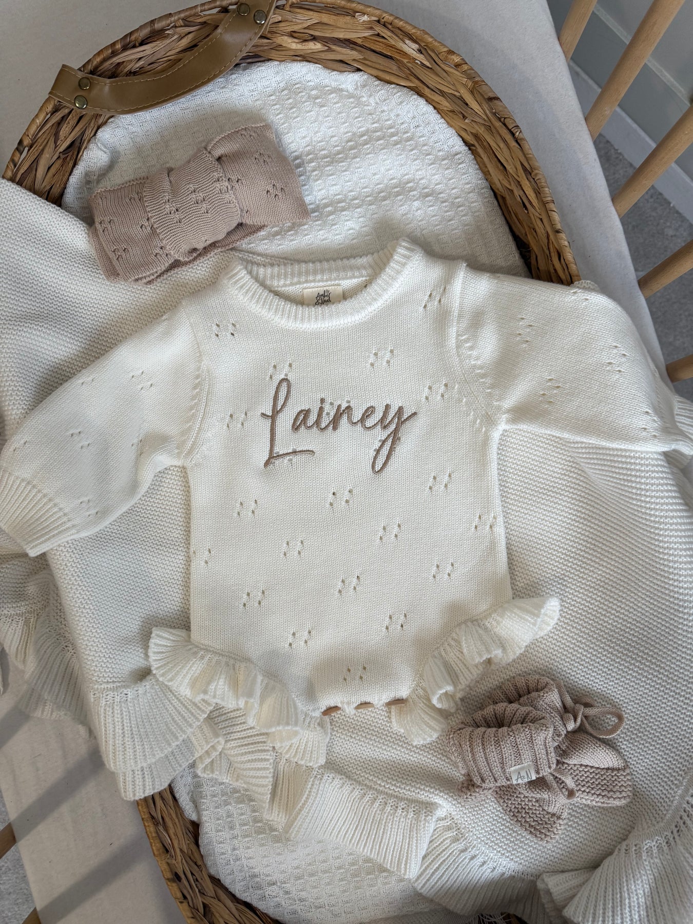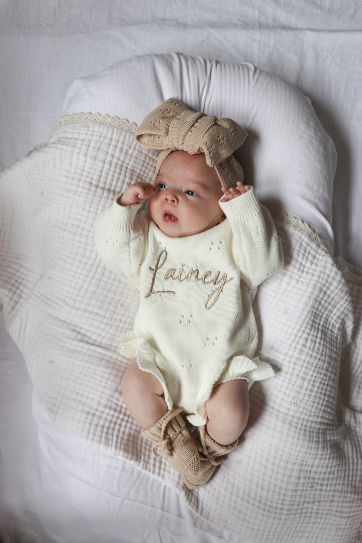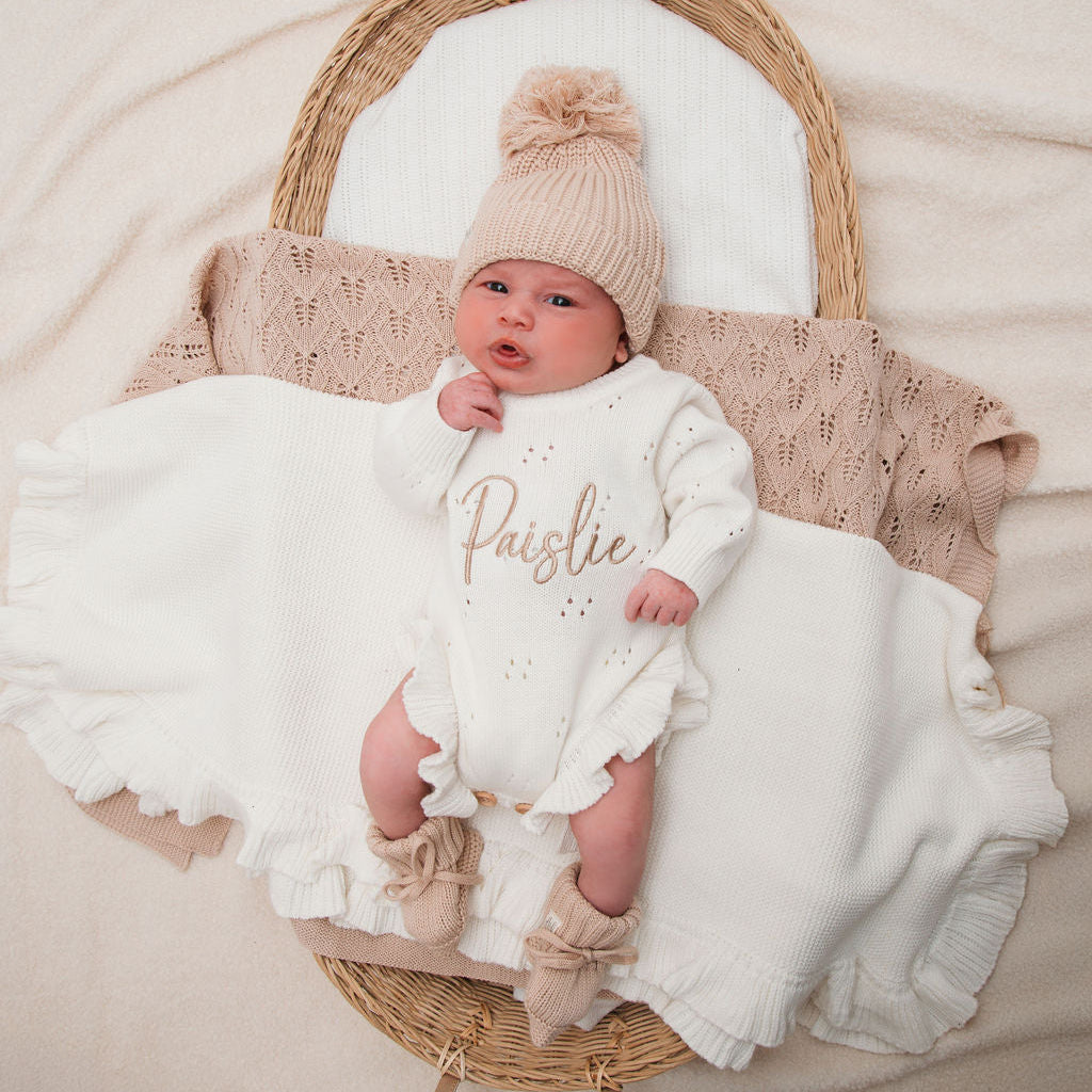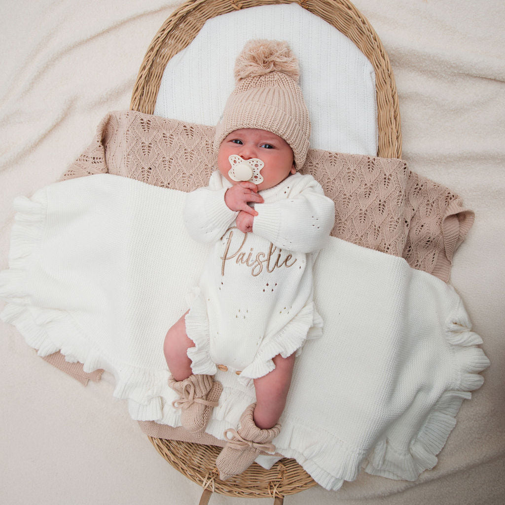 White Pointelle Personalised Luxury Romper. We've paired it with our gorgeous beige embroidery and matching beige accessories.
