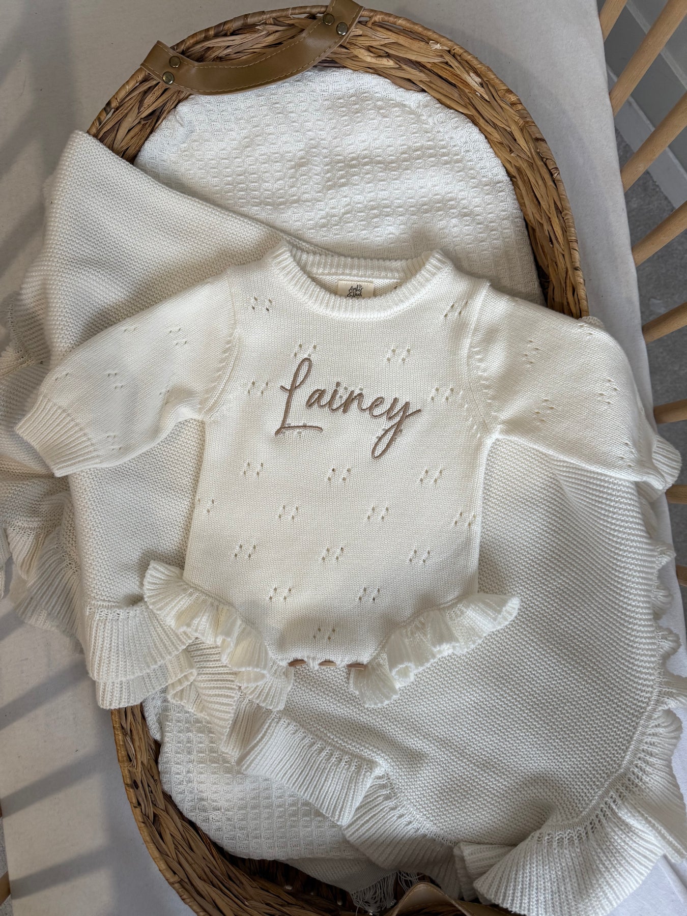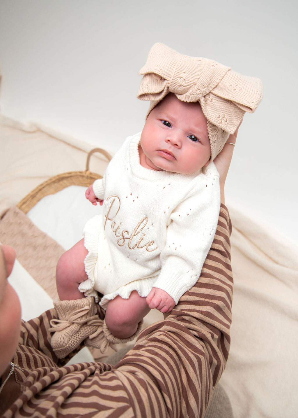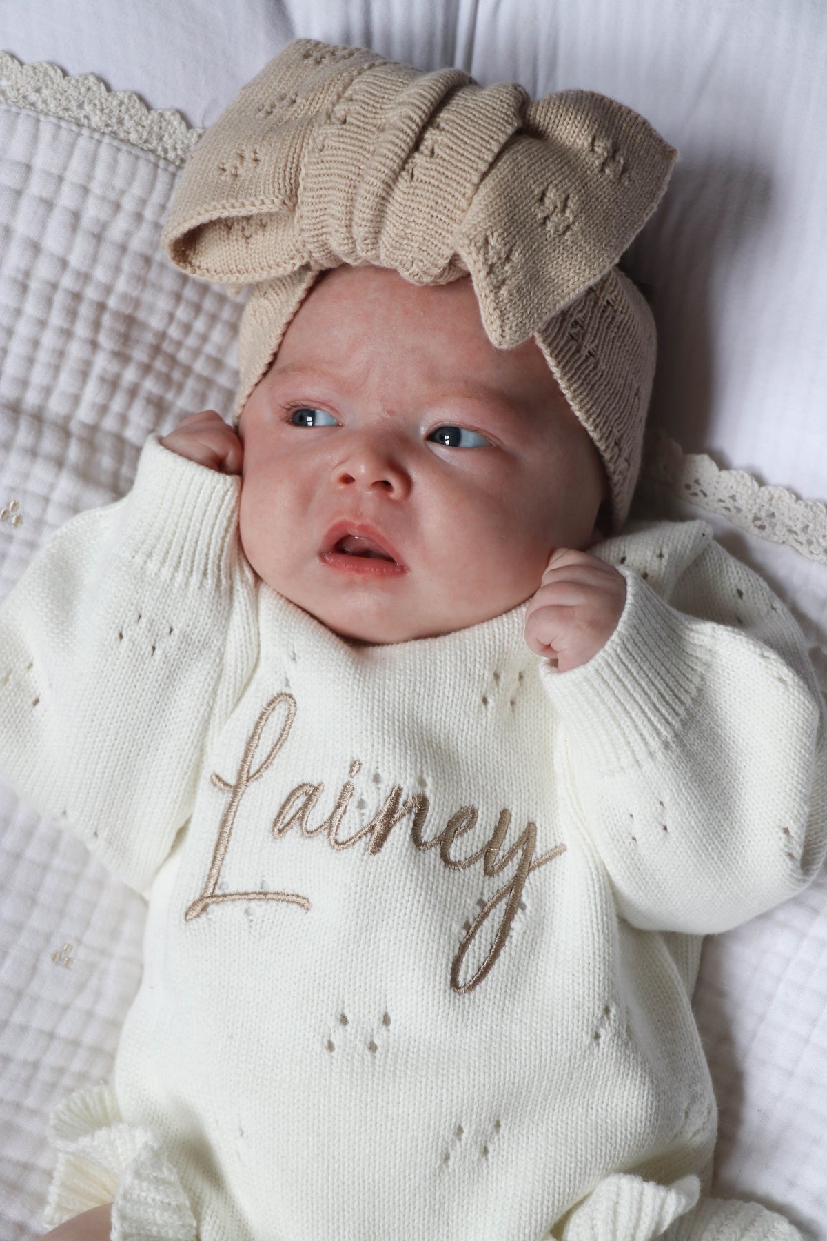 White Pointelle Personalised Luxury Romper. We've paired it with our gorgeous beige embroidery and matching beige accessories.